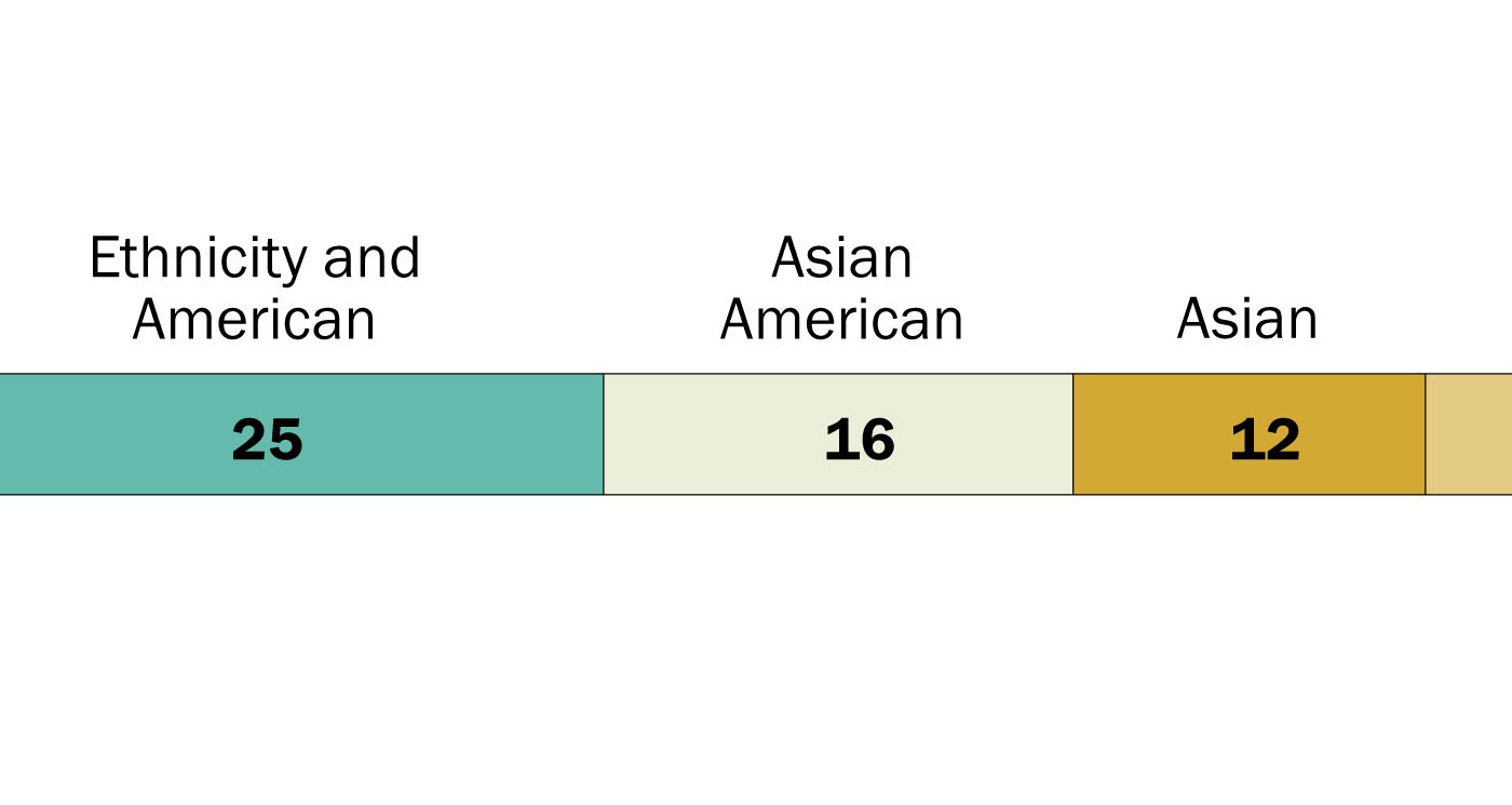 The nation’s Asian population is fast growing and diverse. Numbering more than 23 million, the population has ancestral roots across the vast, ethnically and culturally rich Asian continent. For Asians living in the United States, this diversity is reflected in how they describe their own identity. According to a new, nationwide, comprehensive survey of Asian adults living in the U.S., 52 percent say they most often use ethnic labels that reflect their heritage and family roots, either alone or together with “American,” to describe themselves. Chinese or Chinese American, Filipino or Filipino American, and Indian or Indian American are examples of these variations.