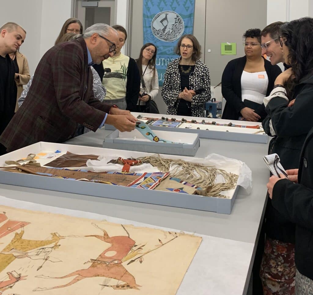 The Autry’s Joe D. Horse Capture leading the Museum of Fine Arts Boston team through close analysis of Plains beadwork. Museum Partners for Social Justice.